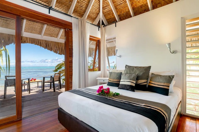 dans un magnifique bungalow aux matériaux locaux avec une vue sur le lagon